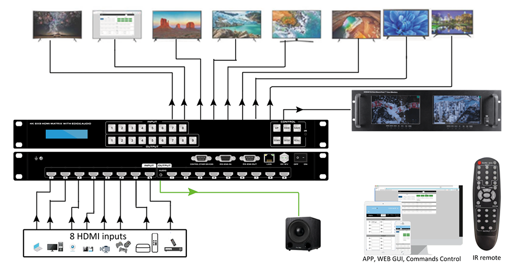 Este é o novo comutador matricial fixo HDMI 4K2K fixo com 8 entradas HDMI e 9 saídas HDMI, a resolução pode chegar até 4K30Hz e todas as portas são compatíveis com HDCP. Com recursos amigáveis de controle por controle remoto IR, botões de pressão de 2 acionamentos com luz azul de fundo, comandos WEB GUI, APP e RS232 / UDP, este switcher matricial pode trabalhar com Blu-Ray Players, Set-Top boxes, Home Theater e consoles de jogos, entre outras fontes de entrada HDMI para rotear exibição aos monitores HDMI, e tem sido amplamente utilizado nas mais diversas aplicações audiovisuais.