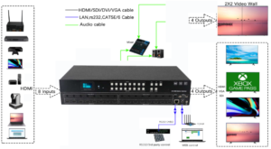 Esta controladora de comutação de imagens HDMI 8×8 4K Seamless Matrix Switcher, suporta o gerenciamento inteligente de EDID via WEB, e aceita conexão de diversos equipamentos audiovisuais, como computadores, DVR, leitores de Blu-Ray, Set-Top-boxes, Home Theater, consoles de jogos, etc.