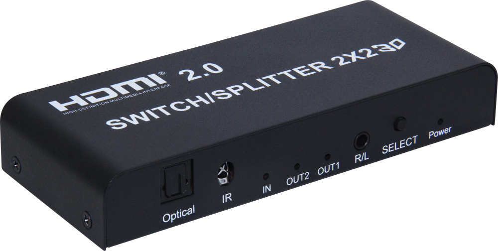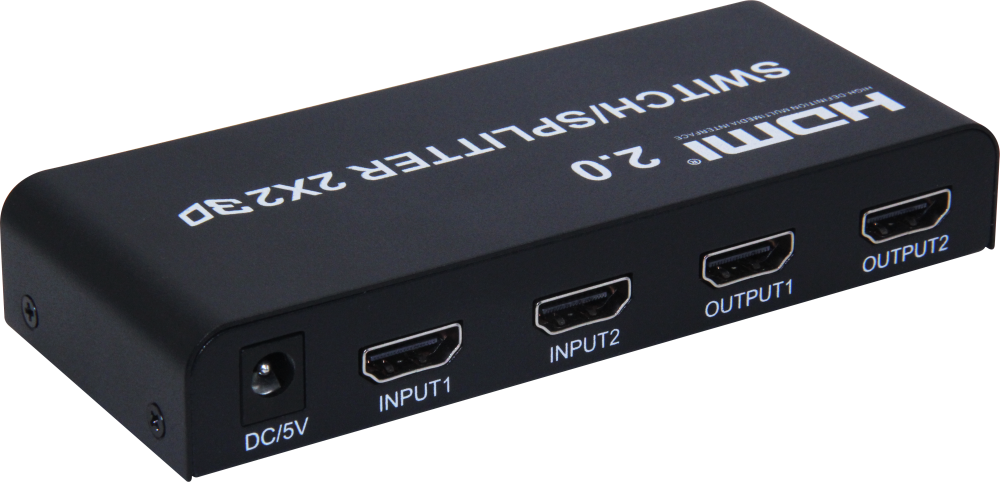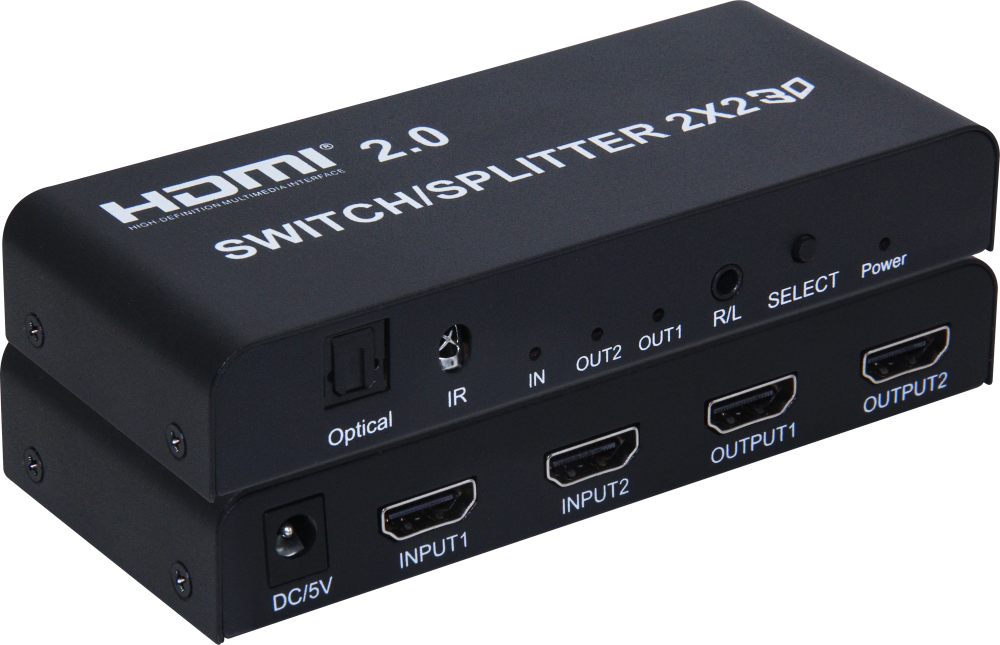 This two signal sources can be switched freely via button or remote control. The HDMI Switcher/Splitter 2×2 can support full HD video format, highest resolution 3840×2160/30Hz.