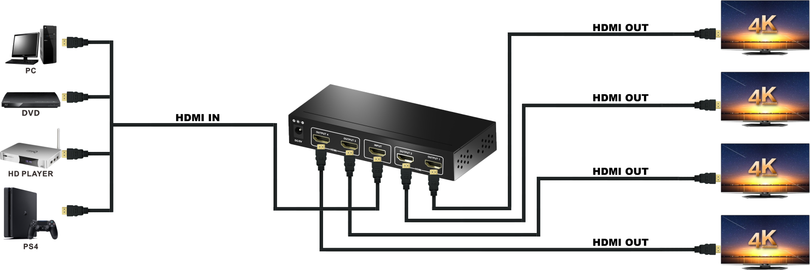 Splitter HDMI é um produto que pode distribuir sinal HDMI sem perda para um dispositivo de exibição de alta definição.