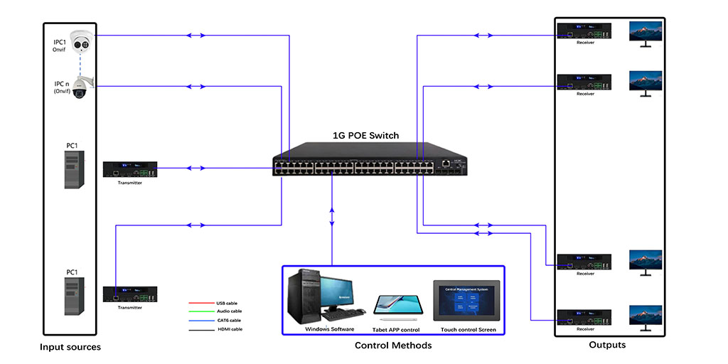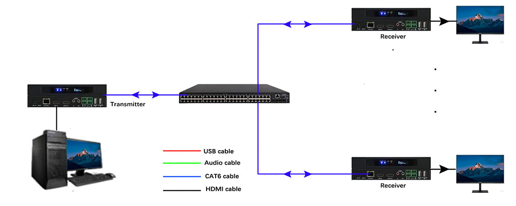 Usando switch de rede 1G, modo de trabalho multicast, as resoluções de entrada e saída são de até 4K30, baixa latência e comutação perfeita entre as fontes. Este sistema pode ser amplamente utilizado nas aplicações comerciais, residenciais ou governamentais.