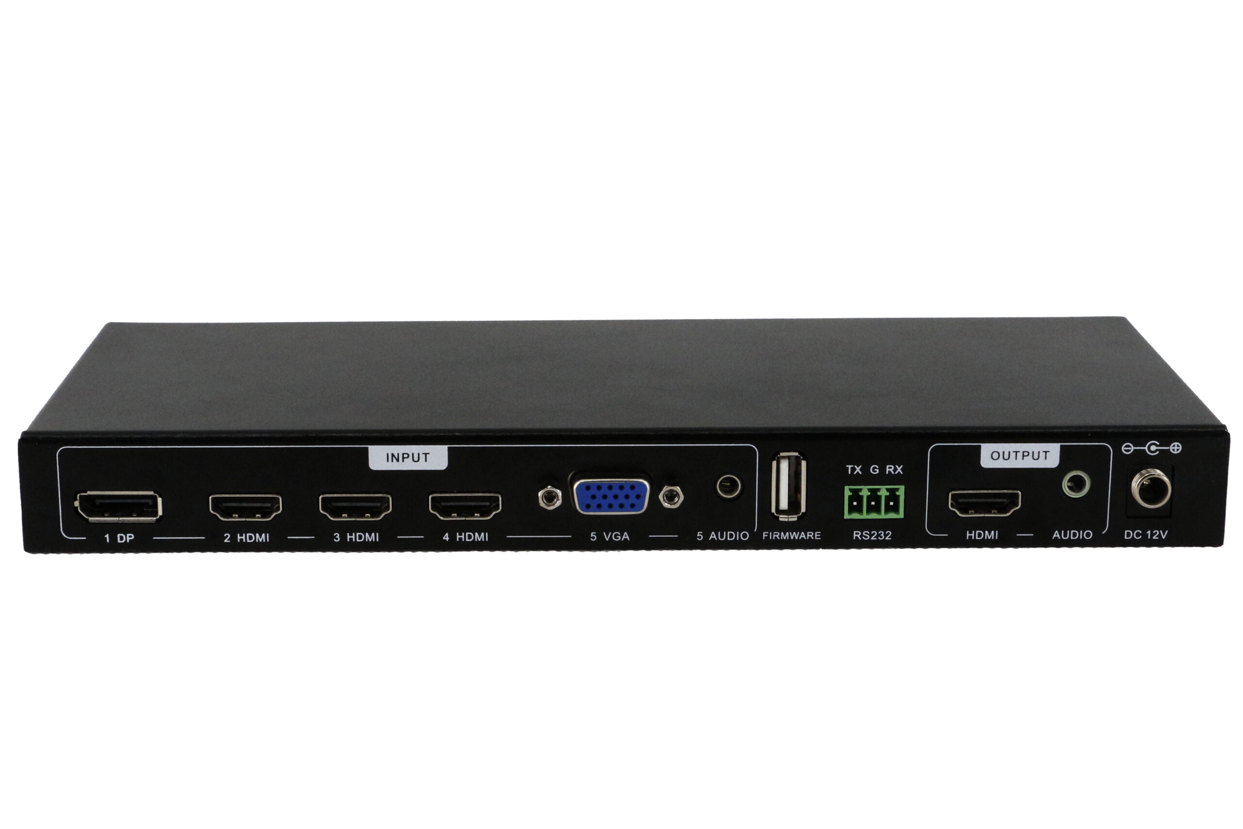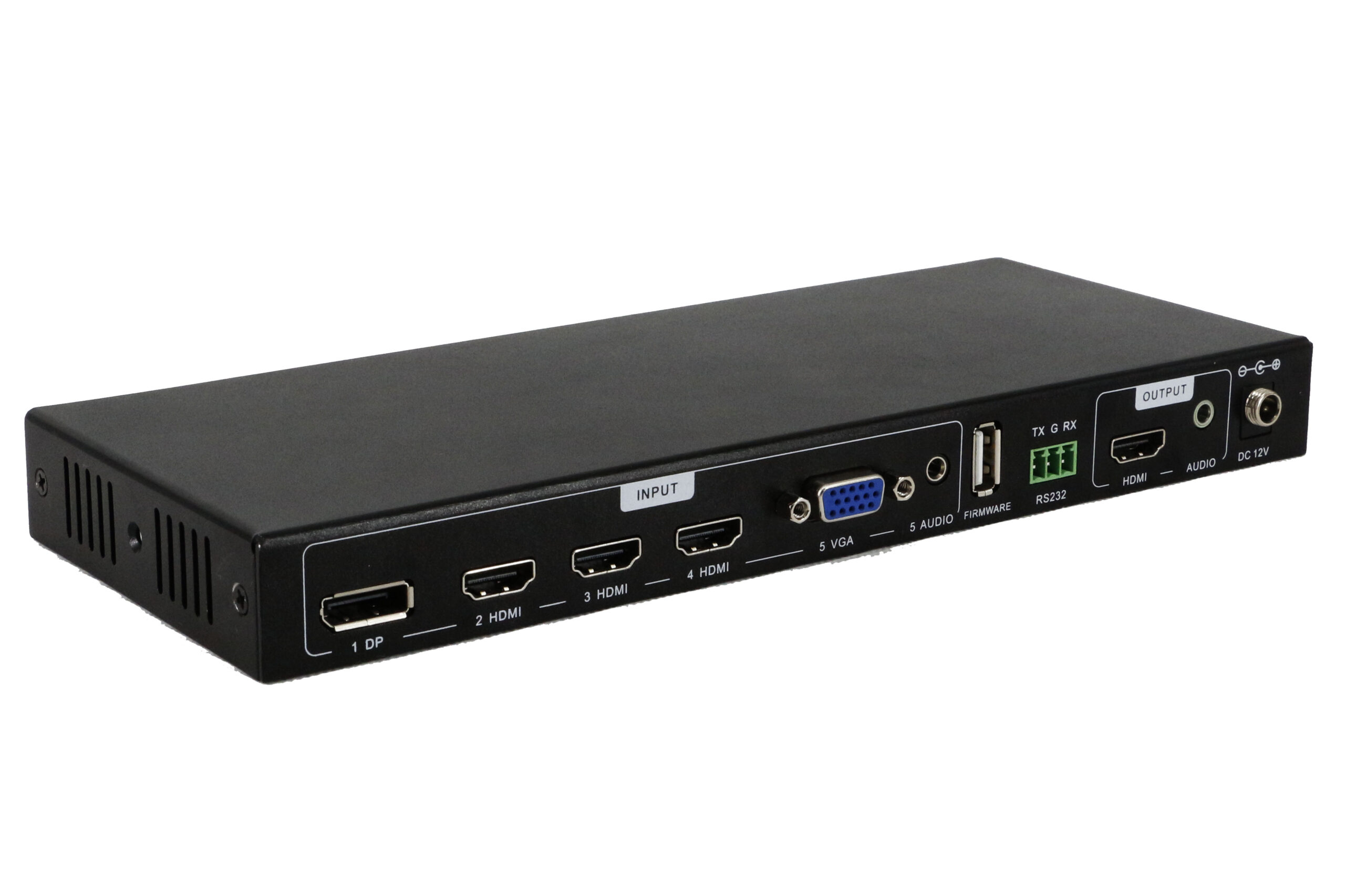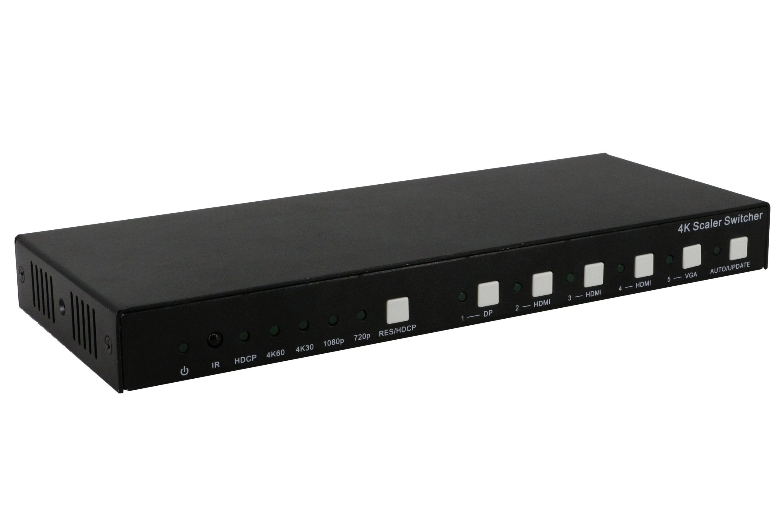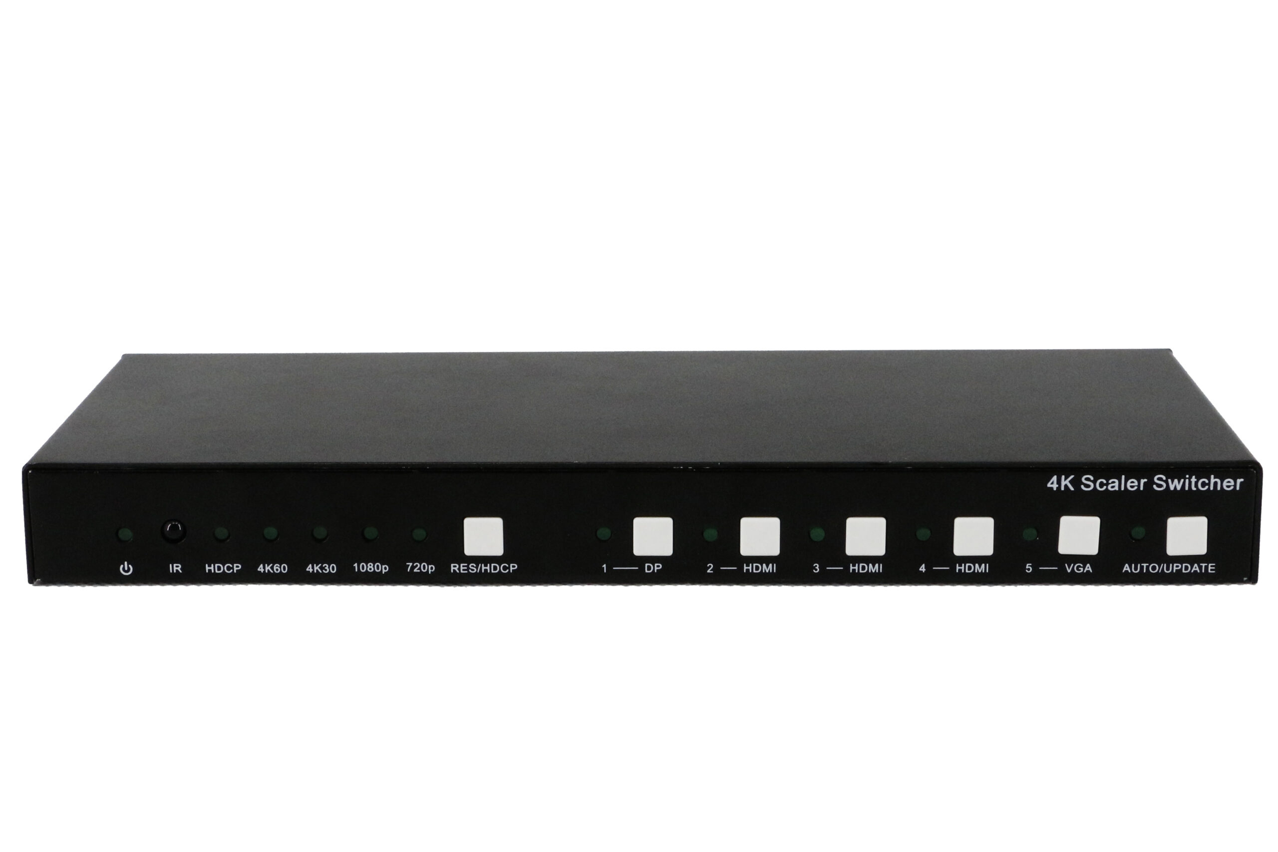 O produto FX-SW-SC-51 é um switch/scaler HDMI 4K de alto desempenho com função de scalling. Ele fornece ao usuário 5 entradas (1 DisplayPort, 3 HDMI e 1 VGA + áudio 3.5mm) e 1 saída (1 HDMI com possibilidade de extração do áudio em conector 3.5mm). O produto conta com a possibilidade de ser gerenciado por botões frontais, para que o operador possa fazer a troca das entradas e também a seleção da resolução na saída, sendo que o equipamento suporta uma resolução máxima de até 4K60Hz e suporta também uma diminuição da resolução para até 720P. Todo esse gerenciamento também pode ser feito através de controle remoto ou porta RS232.
